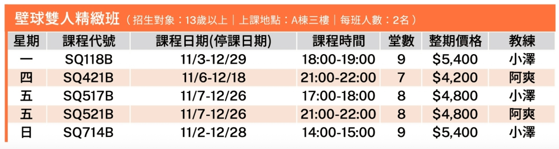 長春國民暨兒童運動中心11-12月壁球課程