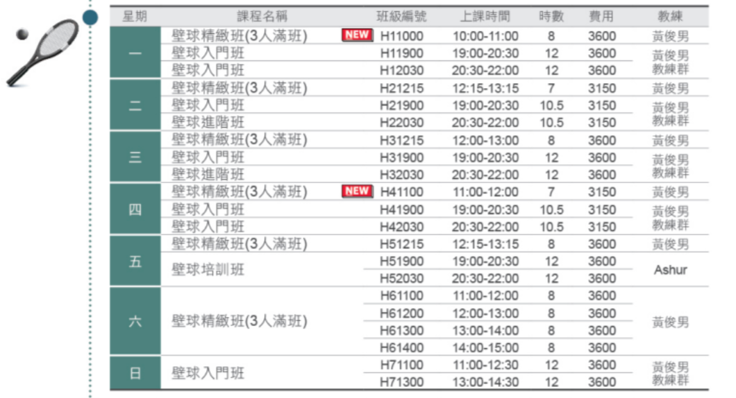 南港運動中心在9月至10月將開辦多個壁球班,課程費用為3150至3600新台幣。更多詳情請閱讀課程簡章。網上報名請按此。