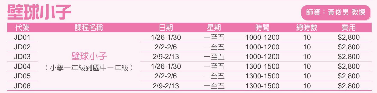 汐止國民運動中心是壁球愛好者提升球技的絕佳地點,特別是其提供由專業教練 黃俊男團隊授課的「壁球班」和「壁球小子」等多元課程。 這裡的教學特色在於採取小班制 (每班 4-6 人,3 人即可開班),確保每位學員都能獲得更充裕的個別指導和姿勢矯正,非常適合從初學者到希望精進技巧的各級球友。 此外,對於報名個別班的學員,還享有上課前 1 小時自主練習場地優惠,讓學習過程更加彈性與高效。 無論是成人團體課程,如表列的 GD119、GD210 等,或是針對學齡兒童的「壁球小子」冬令營課程(JD01-JD06),汐止國民運動中心致力於為社區提供高品質的壁球學習環境。